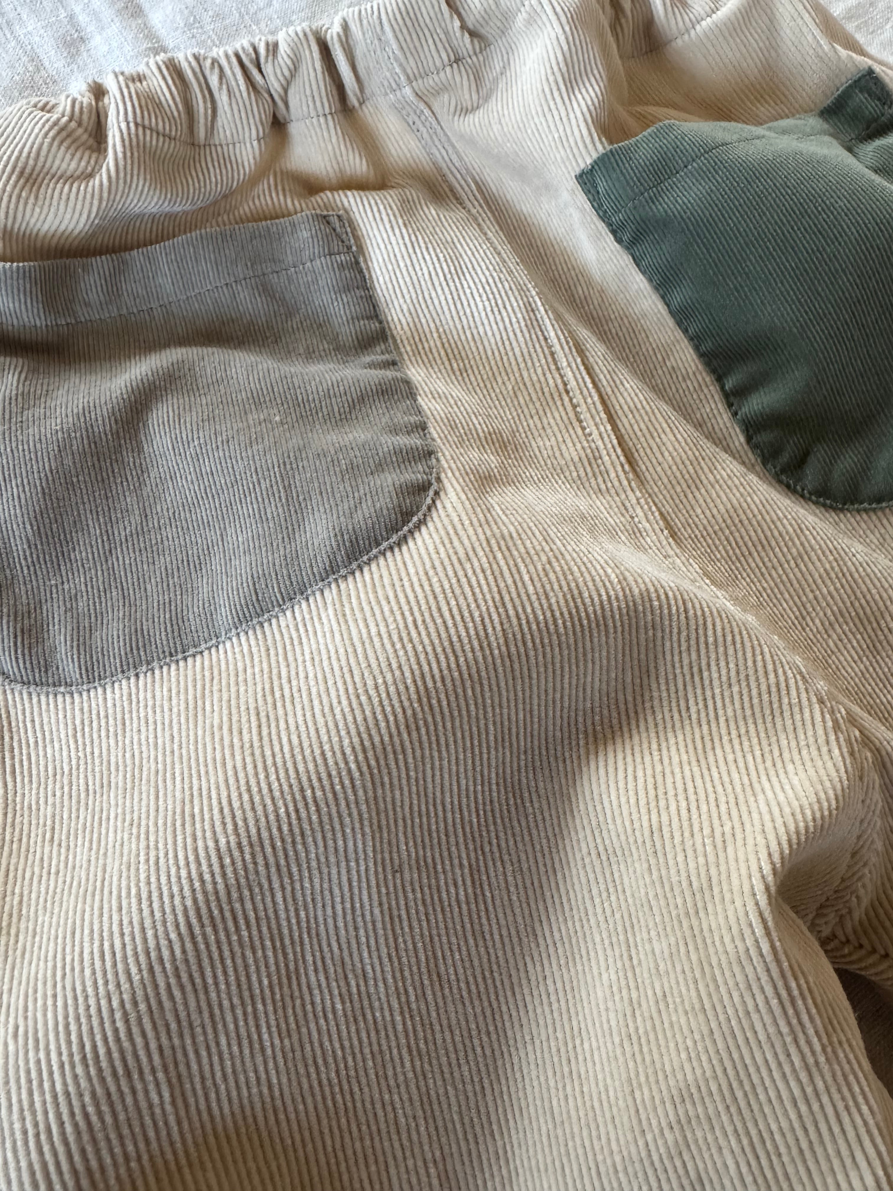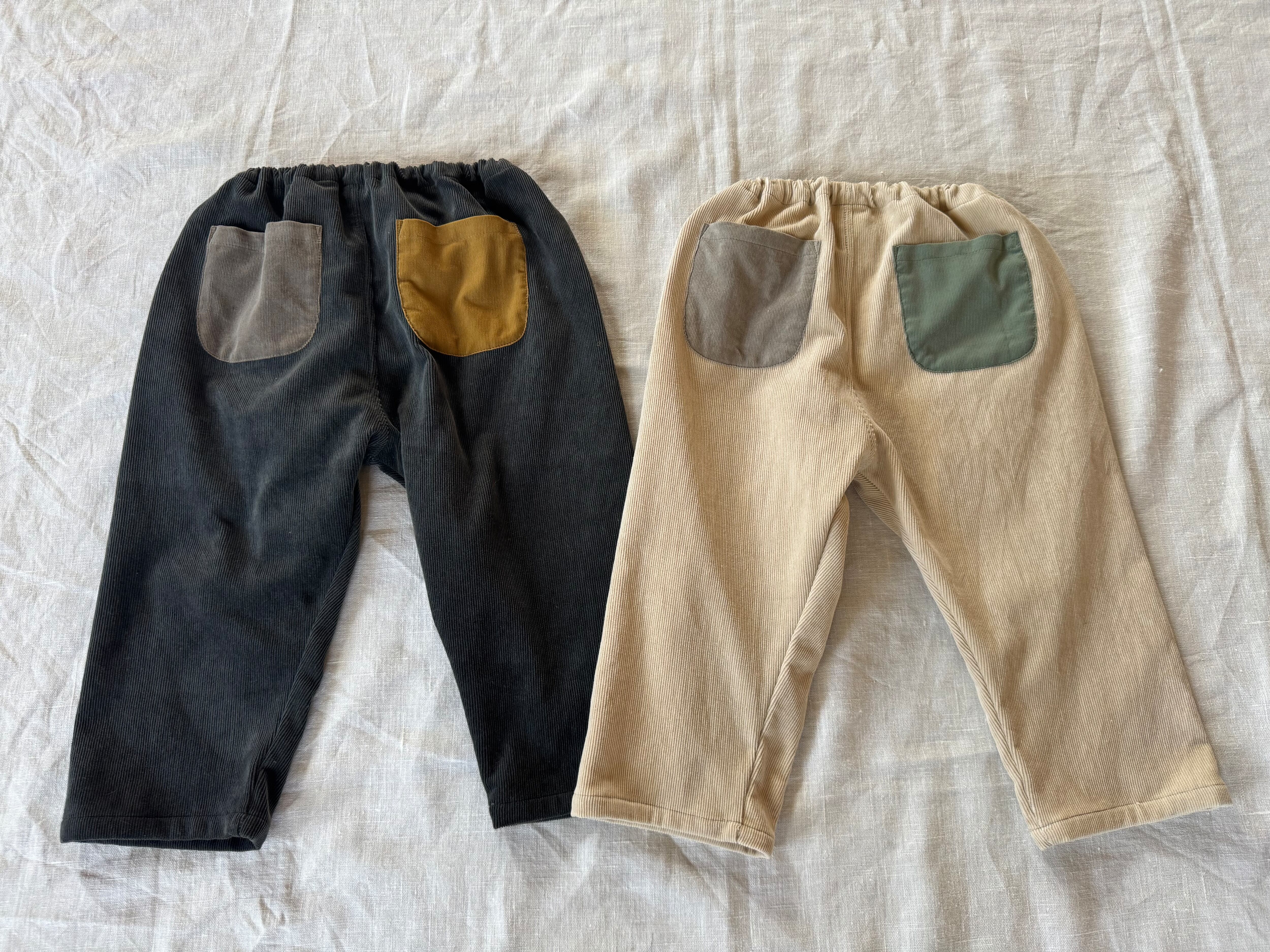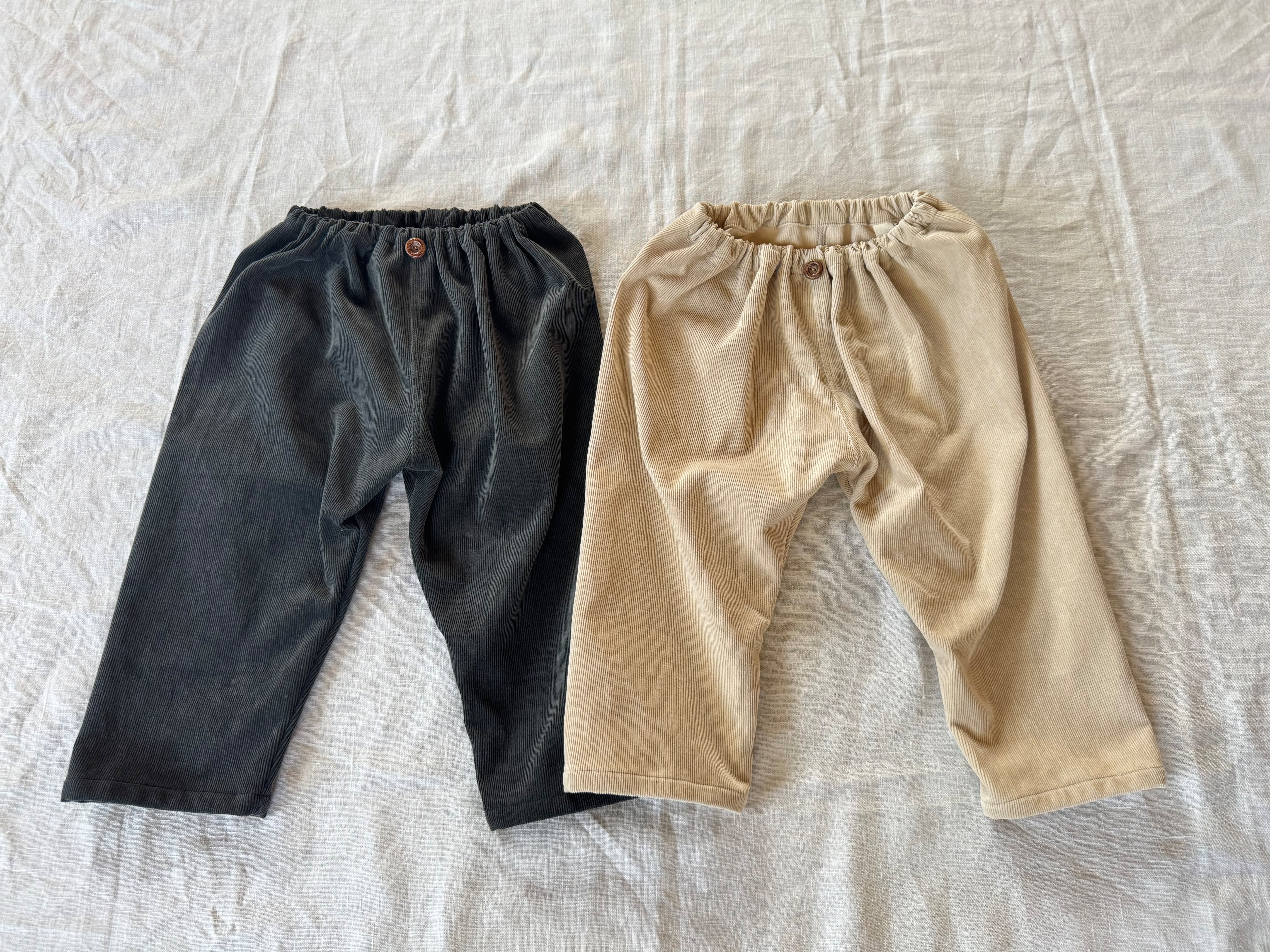 綿100%のやさしい肌触りのコーデュロイパンツです。ゆったりしているので、中にレギンス等を重ねられます。履いた時のシルエットが可愛いパンツです。