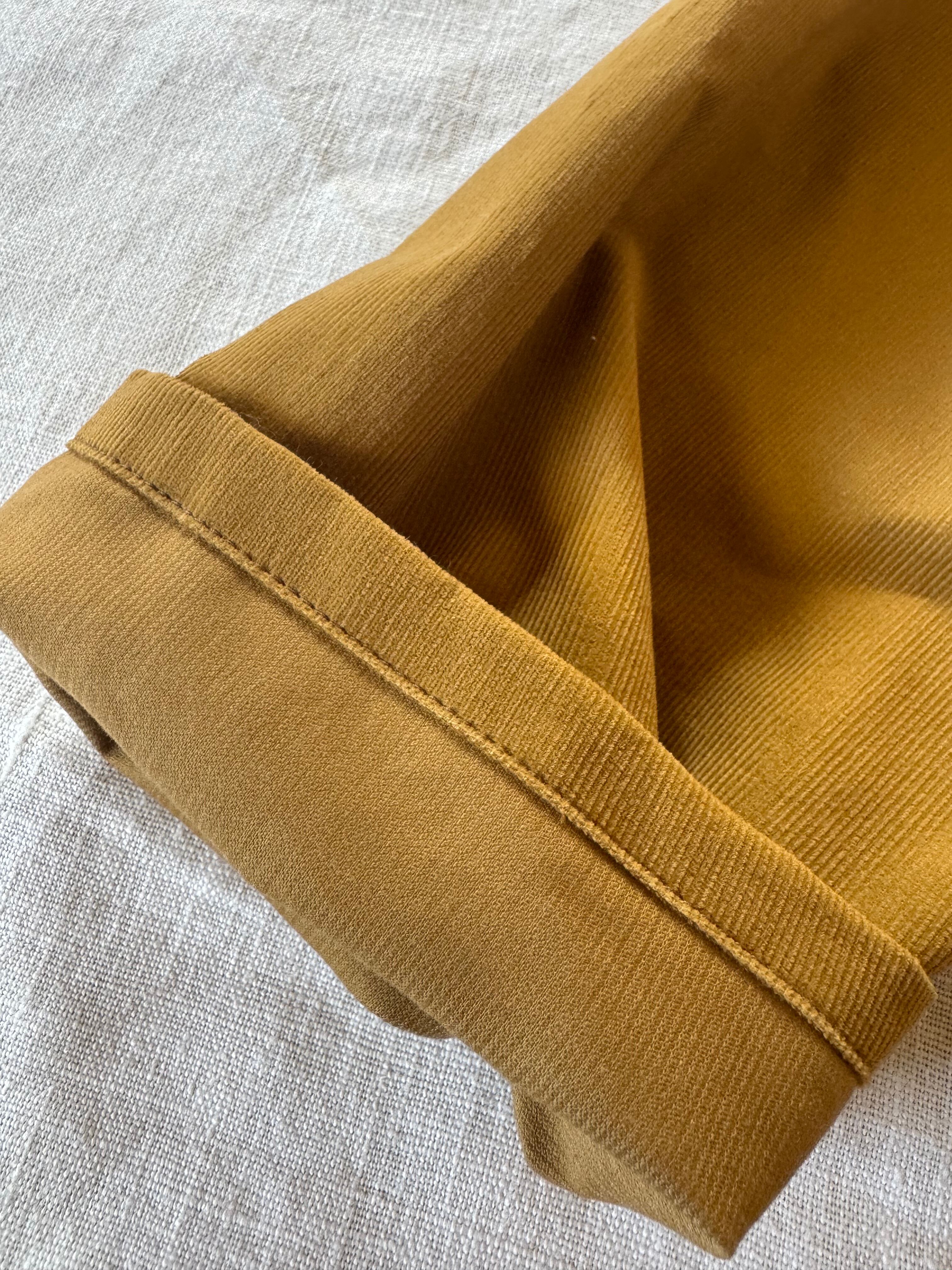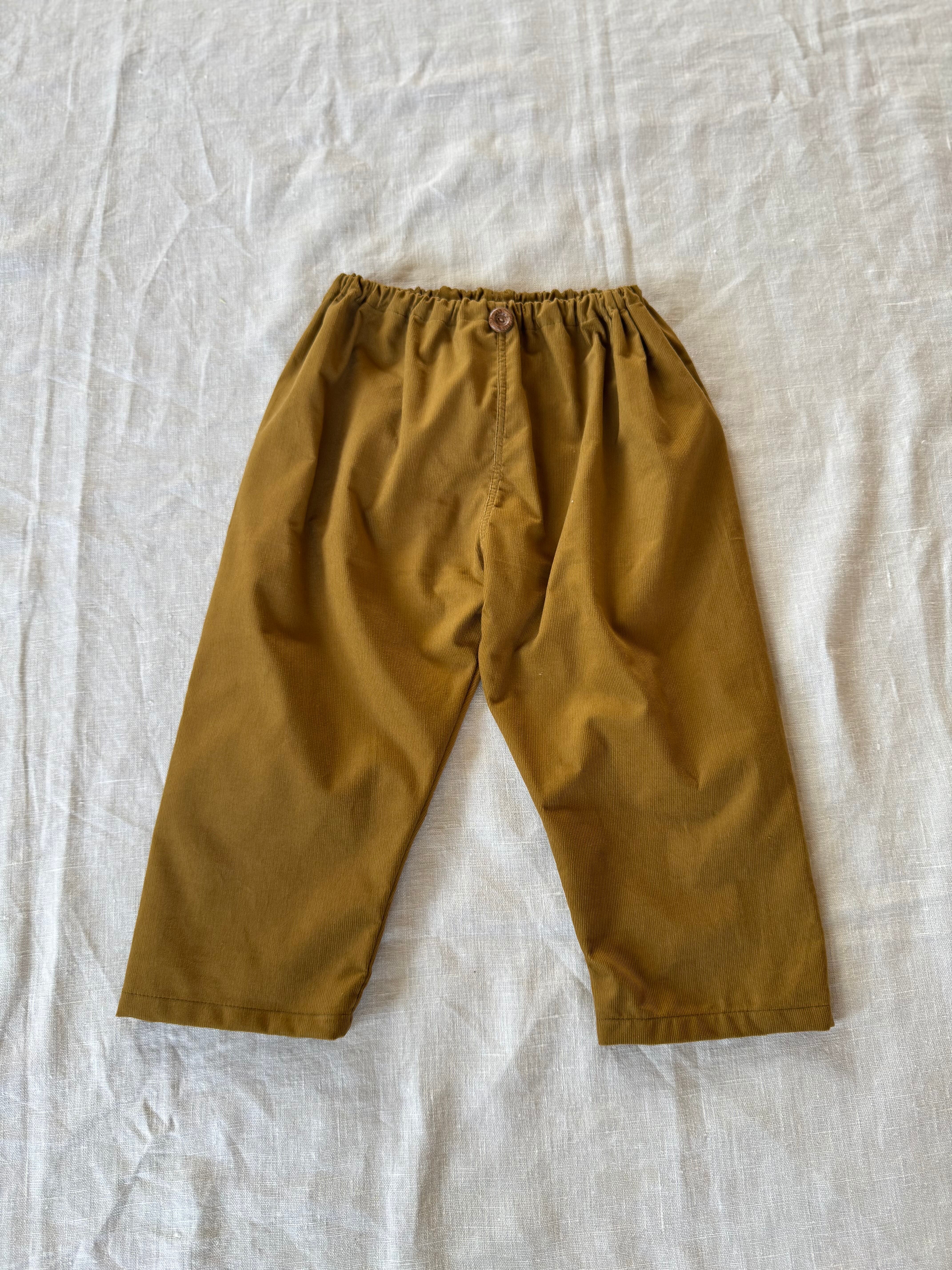 綿100%の少し薄手のコーデュロイパンツです。ゆったりしているので、中にレギンス等を重ねられます。履いた時のシルエットが可愛いパンツです。