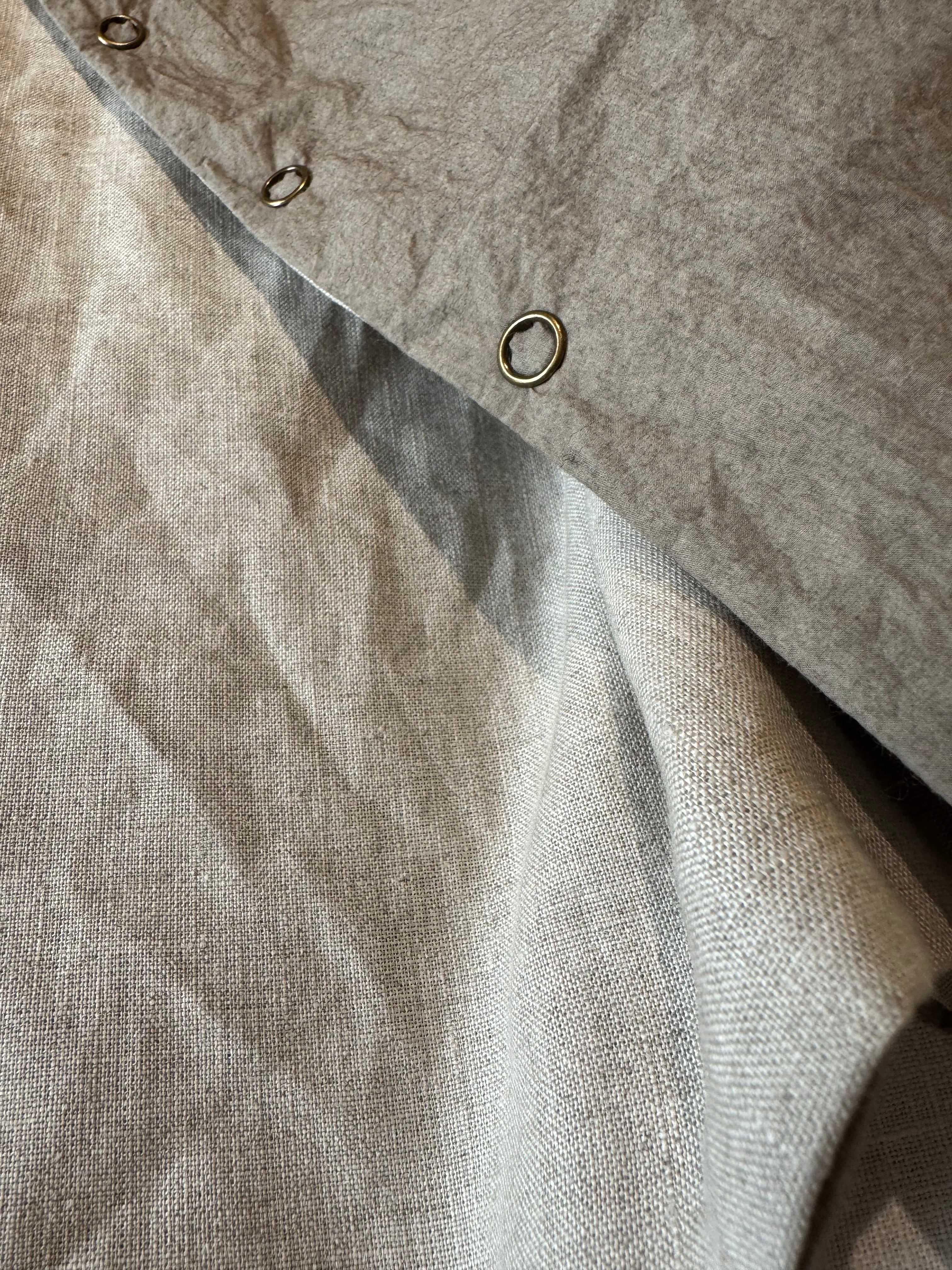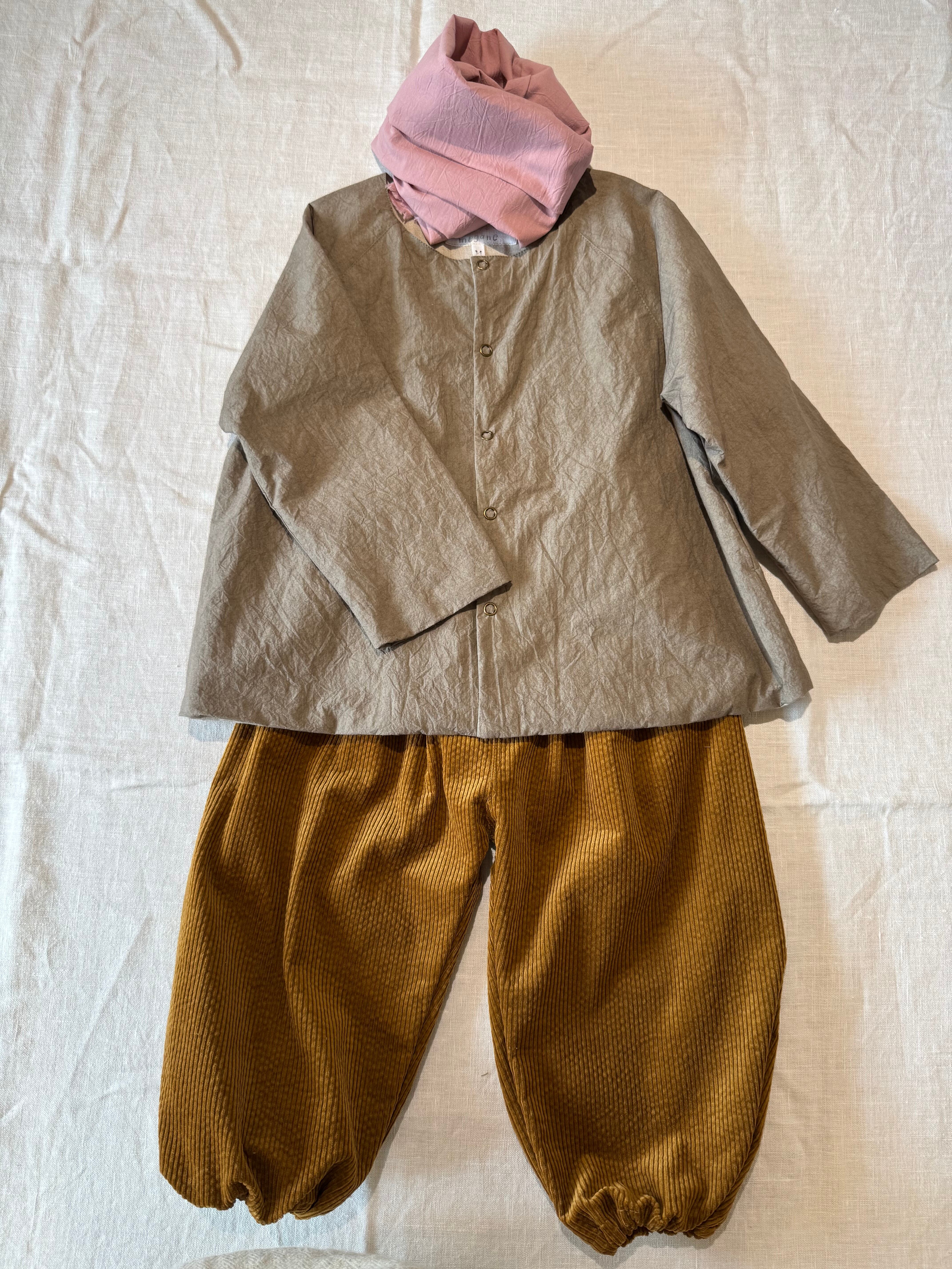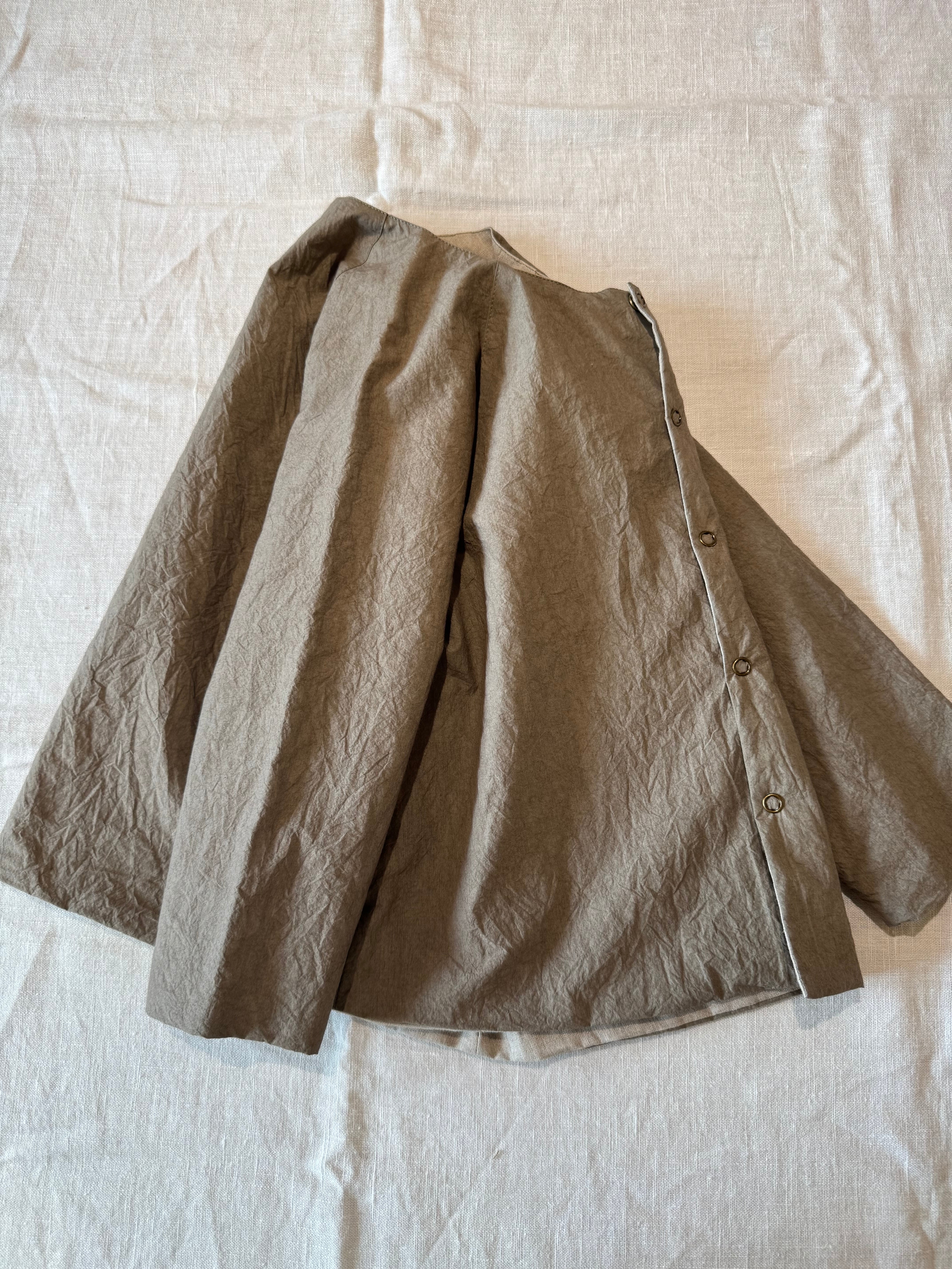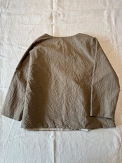素材感が楽しいタイプライター生地(綿100%)と、リネンを組み合わせたシャツカーディガンです。気温差の激しい今、あると便利なアイテムです。リバーシブルでもお使いいただけます。