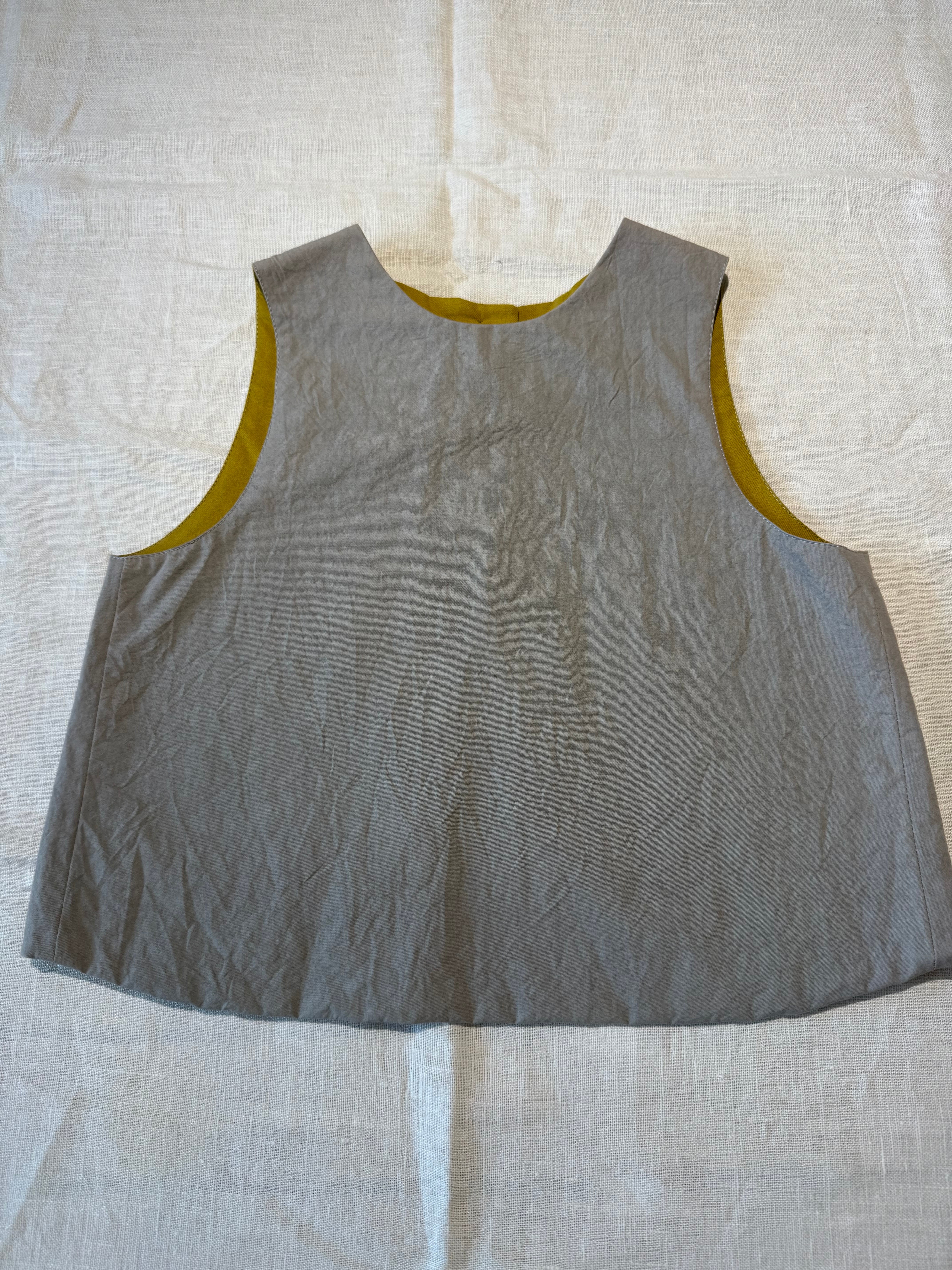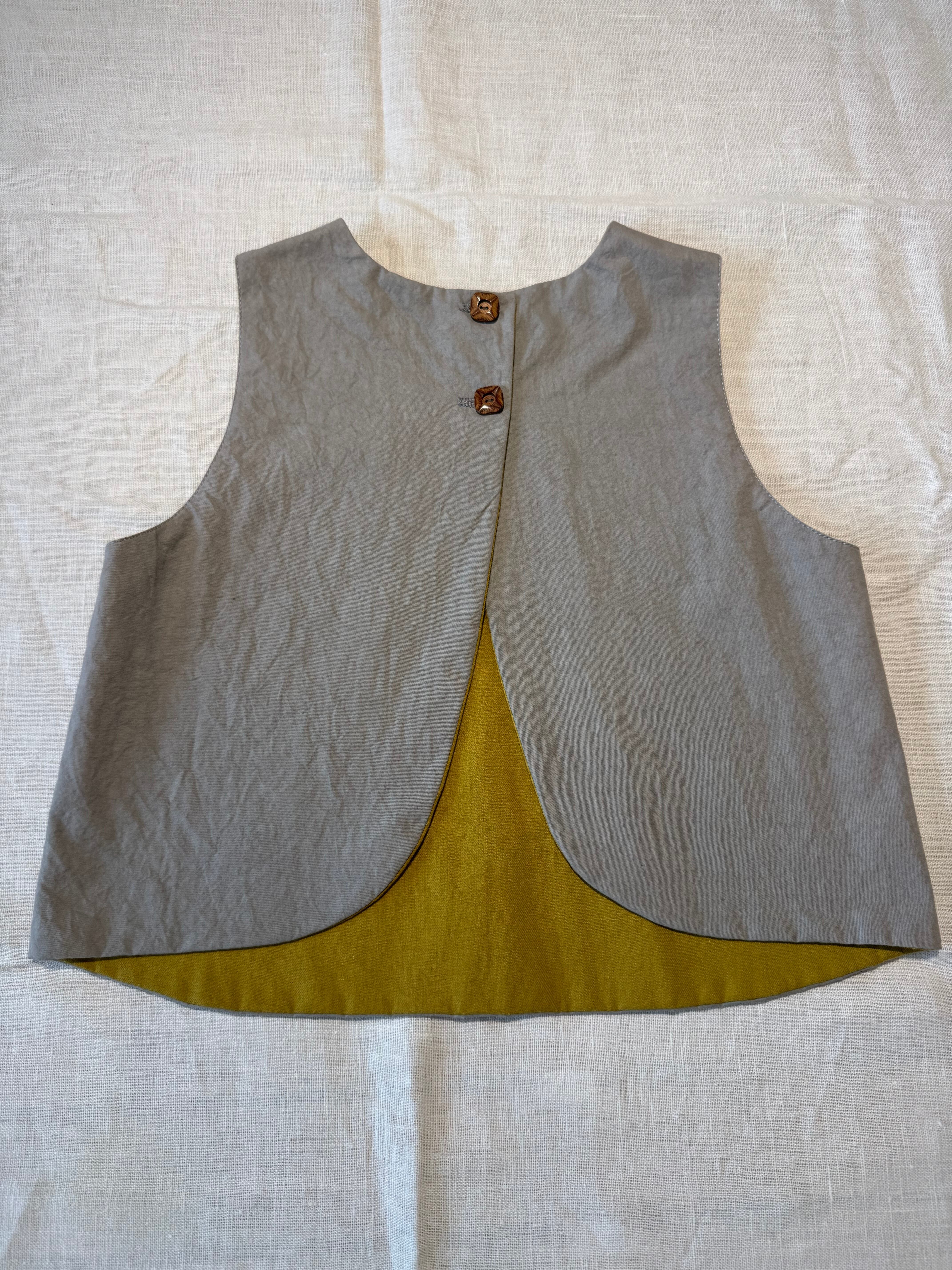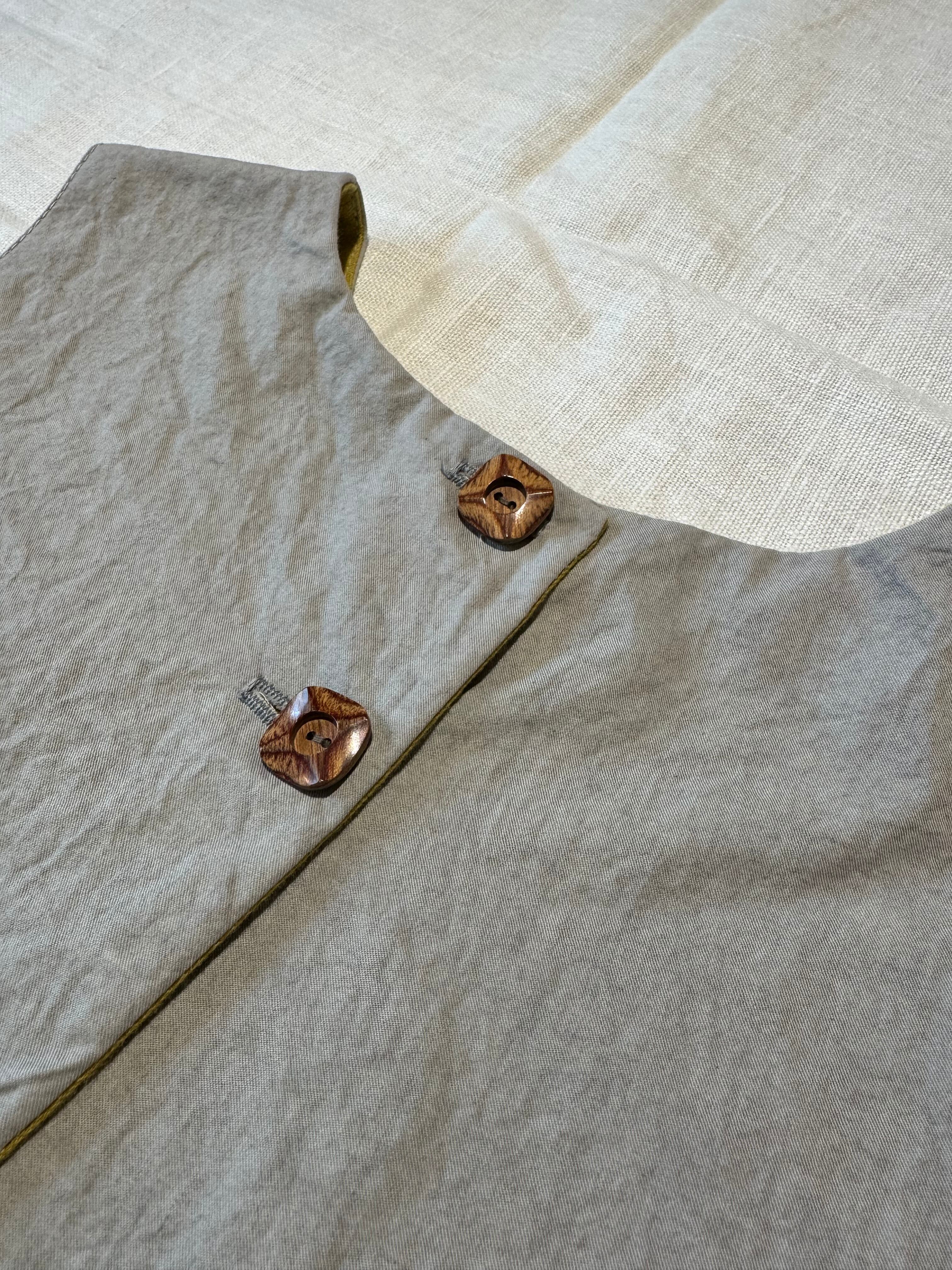 形は後ろあきとなっており、木のボタンが可愛いベストとなっています。